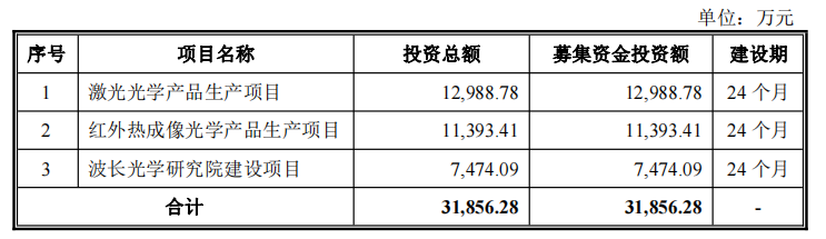 本次拟投资项目的投资总额为3.19亿元,拟投入募资3.19亿元,主要募投项目分别是激光光学产品生产项目、红外热成像光学产品生产项目以及波长光学研究院建设项目。