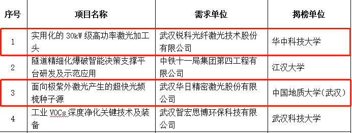 名单显示,共有3项激光项目。分别是“实用化的30kW级高功率激光加工头”项目,需求单位为武汉锐科光纤激光技术股份有限公司,揭榜单位为华中科技大学;“面向极紫外激光产生的超快光频梳种子源”项目,需求单位为武汉华日精密激光股份有限公司,揭榜单位为中国地质大学(武汉);“大型球弧板坡口激光切割机技术研发与应用”,需求单位为武汉予成激光智造有限公司,揭榜单位为湖北工业大学。