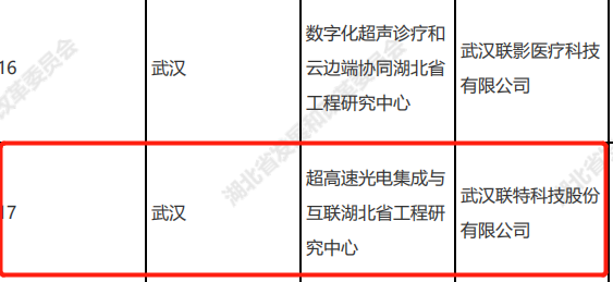 名单显示,依托光电企业联特科技的工程研究中心通过认定,工程中心名称为超高速光电集成与互联湖北省工程研究中心。