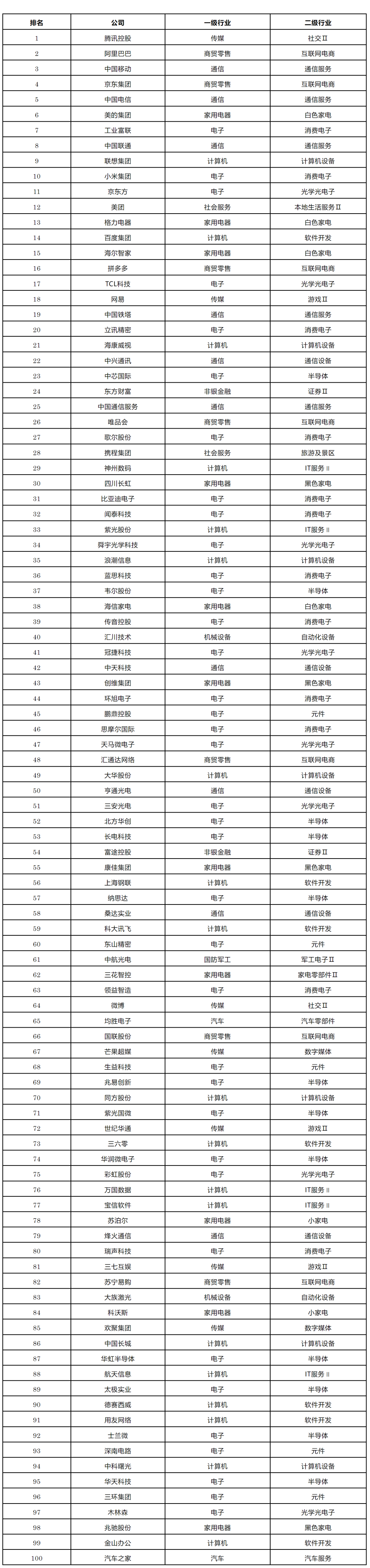 中国数字经济企业中综合实力表现突出的100家企业入选“2022中国数字经济100强”,排在前十位的依次是腾讯、阿里巴巴、中国移动、京东、中国电信、美的集团、工业富联、中国联通、联想集团和小米集团,覆盖了互联网、电信运营商和家电、电子制造企业。