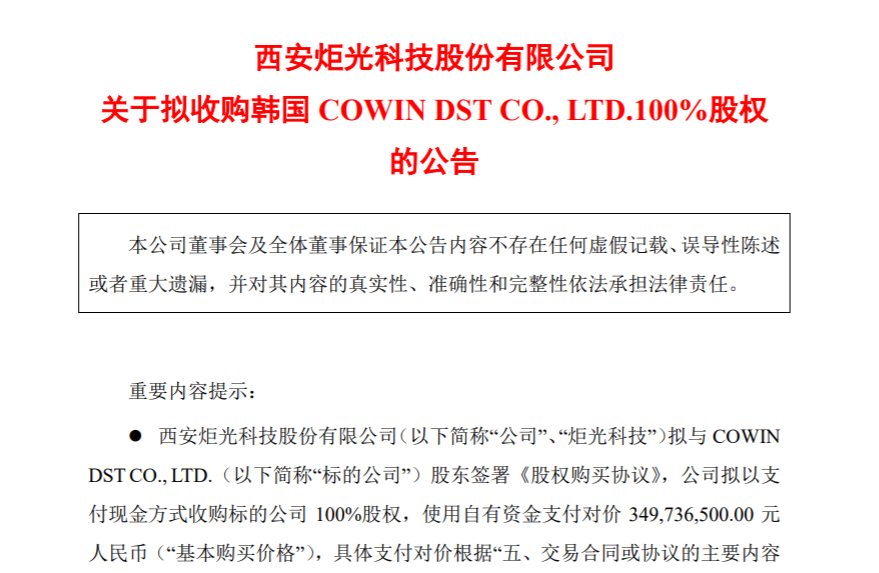 9月10日,西安炬光科技发布公告称,公司拟使用自有资金约3.5亿元(“基本购买价格”),收购韩国COWIN DST CO.,LTD.100%股权。