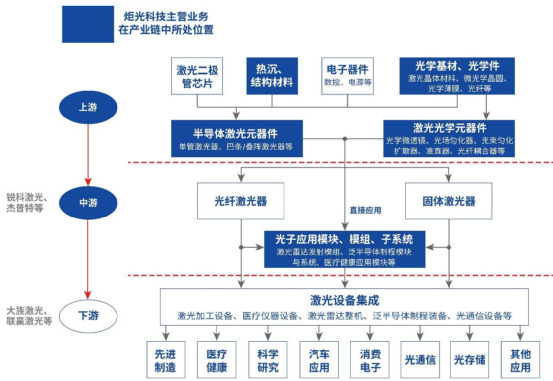 公司主要从事光子行业上游的高功率半导体激光元器件和原材料(“产生光子”)、 激光光学元器件(“调控光子”)的研发、生产和销售,目前正在拓展光子行业中游的光子应用模块、模组和子系统业务(“提供光子应用解决方案”)。公司重点布局汽车应用、泛半导体制程、医疗健康三大应用方向,向不同客户提供上游核心元器件和中游光子应用解决方案。