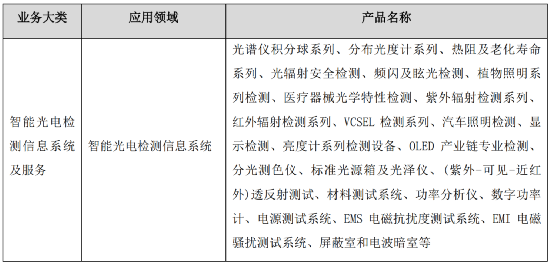 公司光电检测领域产品及服务定位于中高端市场,为照明、显示、汽车、医疗设备、电子电器等诸多行业提供成熟检测设备和测量解决方案。公司的光电检测技术和校准服务具备国际先进水平,产品在国内市场占有率和出口量均处于领先水平。