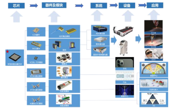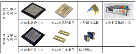 公司聚焦半导体激光行业,核心产品为半导体激光芯片,并且依托高功率半导体激光芯片的设计及量产能力,纵向往下游器件、模块及直接半导体激光器延伸,横向往 VCSEL 芯片及光通信芯片等半导体激光芯片扩展,主要产品包括高功率单管系列产品、高功率巴条系列产品、高效率 VCSEL 系列产品及光通信芯片系列产品。