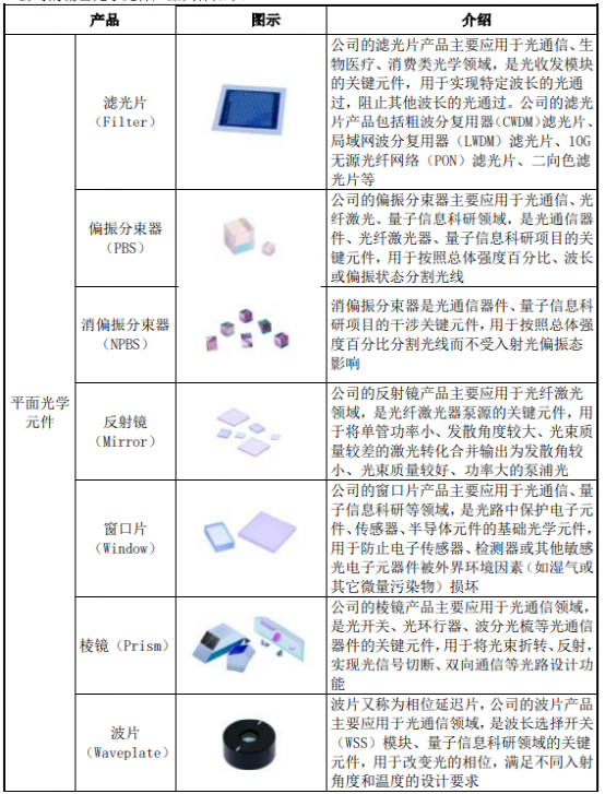 公司是主要从事精密光电薄膜元件研发、生产和销售的高新技术企业,并具备镀膜材料自研和生产能力,主要产品为摄像头滤光片和光通信元件等,可广泛地应用于消费类电子产品、车载摄像头、安防监控设备以及光通信信号传输、数据中心等多个应用终端领域中。