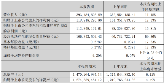 福晶科技8月18日晚间发布半年度业绩报告称,2022年上半年营业收入约3.93亿元,同比增加11.48%;归属于上市公司股东的净利润约1.19亿元,同比增加17.33%;基本每股收益0.2782元,同比增加17.33%。