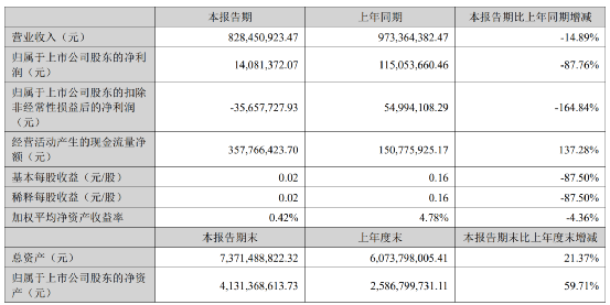 乾照光电8月22日晚间发布半年度业绩报告称,2022年上半年营业收入约8.28亿元,同比减少14.89%;归属于上市公司股东的净利润约1408万元,同比减少87.76%;基本每股收益0.02元,同比减少87.5%。