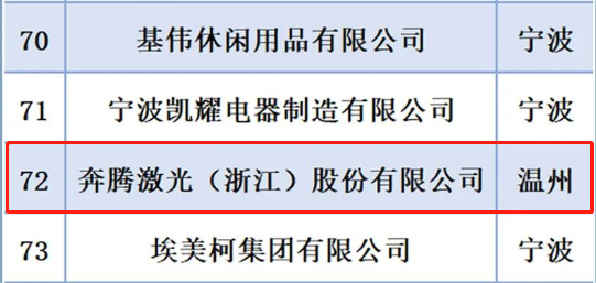 榜单显示,高端激光智能装备商奔腾激光(浙江)股份有限公司上榜“2022浙江省成长性最快百强企业”。