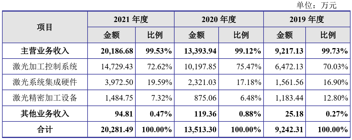 金橙子的营收结构显示,公司主营业务收入自于激光加工控制系统、激光系统集成硬件、激光精密加工设备等产品。金橙子表示,公司在激光加工控制系统领域处于领先地位,精密振镜控制、伺服电机控制等技术路线齐全。