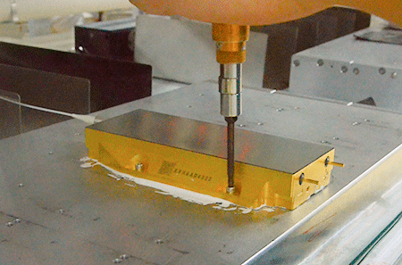 4、在激光器模块底部均匀涂上一层导热硅脂,厚度大约100um(如图4);然后对准安装孔位,把激光器模块放置到冷却板上。