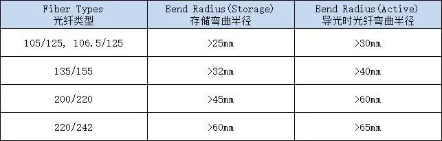 为避免光纤受损,光纤需盘绕成圈。当存贮和运输时,光纤的弯曲半径应当大于200倍的光纤直径;当激光工作时,光纤的弯曲半径应当更大,具体参考下表。