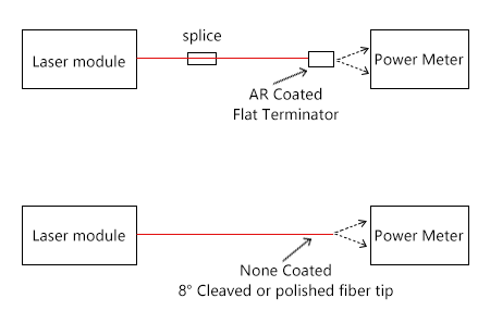 在最大驱动电流下,激光模块输出光纤尾端端面的反射光返回到激光器内部,可能会导致激光二极管功率降级,严重时会直接使激光器失效。为了避免损伤激光器,在测试激光模块的输出功率前,需要在其输出光纤上熔接一根镀有增透膜的输出端光纤,或者将输出光纤端面切割或者研磨成 8°斜面角,然后再测试输出功率,参考图8示意图。