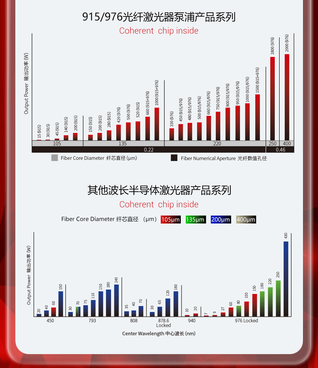 星汉激光光纤耦合半导体激光器,包括105um、135um、200um等多种不同光纤芯径输出,激光功率涵盖几十瓦到上千瓦,输出波长涵盖400nm至1000nm,具备多单管耦合、高可靠性、防反射保护、高光电转化率、波长覆盖范围广等特性,广泛应用于工业加工、精密加工、医疗美容、科学研究、传感检测、照明等领域。