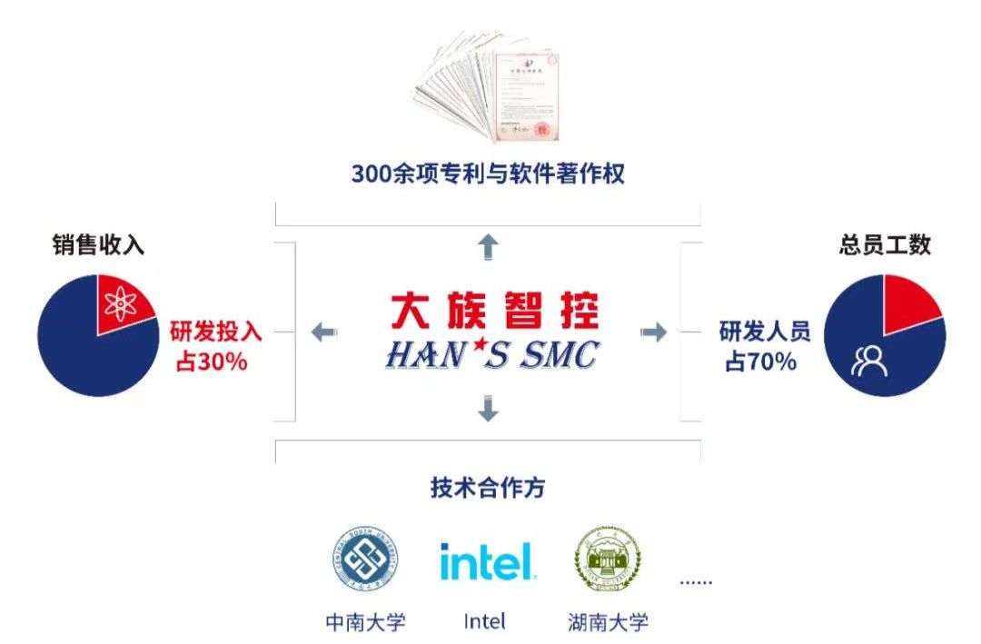 大族智控是智能制造领域一家具备核心技术竞争力的高新技术企业,公司目前拥有300余项专利及软件著作权,研发人员占比超过70%,研发投入占销售收入的比例高达30%;公司常年与Intel、中南大学、湖南大学等重点高校保持紧密合作,持续推动项目研发和技术创新。
