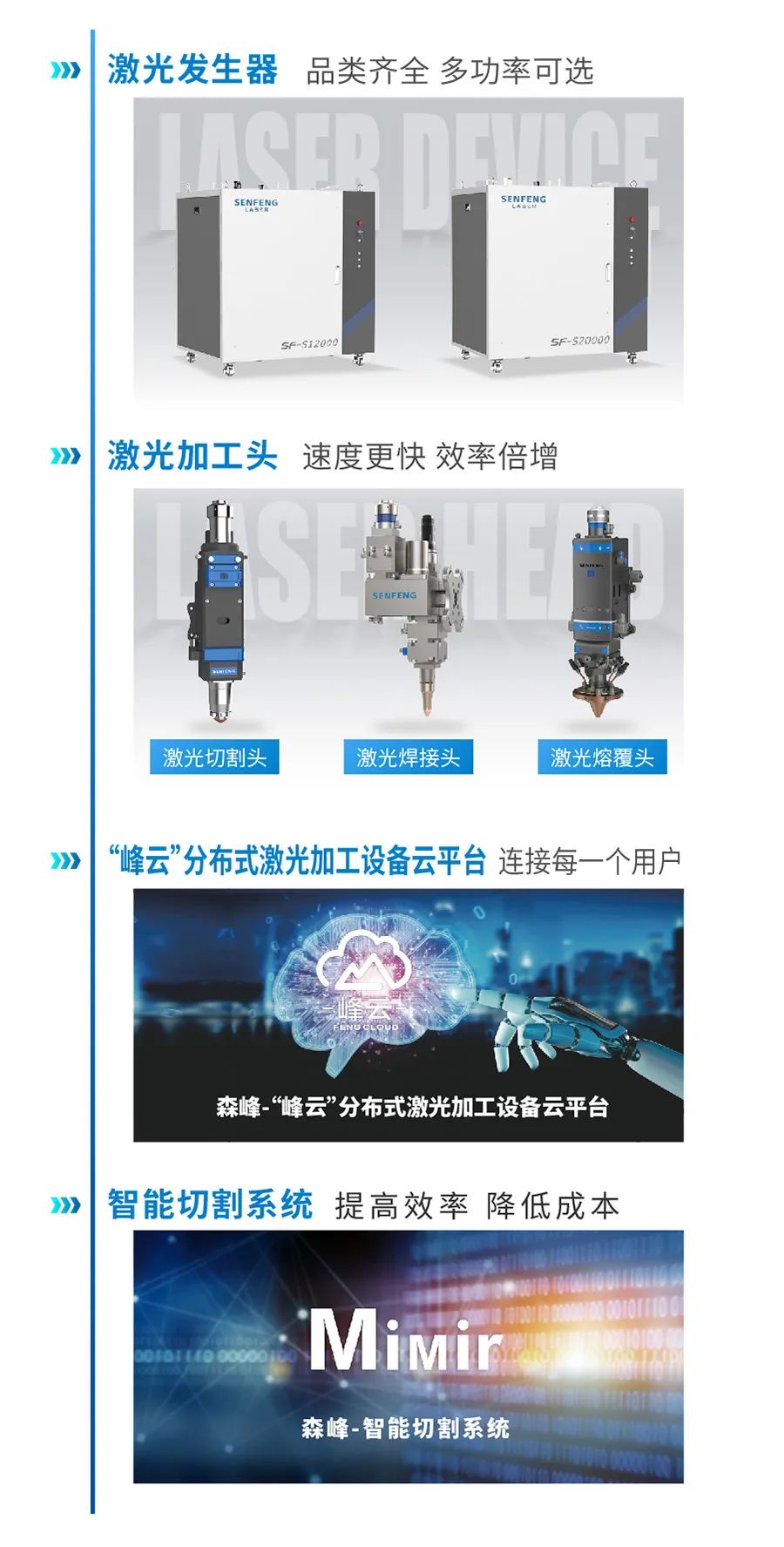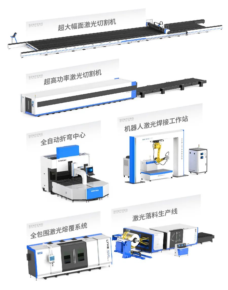 面对激光市场中普遍存在东拼西凑、多家采购零部件的乱象,森峰激光以产品为本,交付给客户真正可信赖的设备。多年来不断突破与创新,森峰激光现已成为激光全产业链发展的科技创新型企业典范,集切割、折弯、焊接、熔覆、自动化于一体,涵盖激光切割设备、激光焊接设备、激光熔覆设备、激光清洗设备、折弯中心及激光柔性加工生产线多种激光应用。