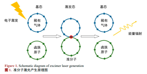 气体紫外激光器主要有准分子激光器、氩离子激光器、氮分子激光器、氟分子激光器、氦镉激光器等。准分子激光器等通常用于激光加工[2]。准分子激光器是以准分子为工作物质的气体激光器,它也是一种脉冲激光器,从 1971 年第一台准分子激光器的诞生[3],就有了巨大的研究意义。准分子是一种不稳定复合的分子,在一定情况下会分解成原子。重复频率和平均功率为评判准分子激光器的依据。一定比例的 Ar、Kr、Xe 等的稀有气体和 F、Cl、Br 等的卤族元素相混合是紫外气体激光器的主要工作物质,实现泵浦的方法是用电子束或脉冲放电达到。基态的惰性气体原子和稀有气体原子受激发后,核外电子从而被激发到更高的轨道使最外层电子层被填充满,并与其他原子结合形成准分子,随后跃迁回基态再分解成原来的原子,剩余能量以光子的形式分离出来最后经过谐振腔的放大得到紫外激光如图 1 所示[1]。液态氙为早期的准分激光器的工作物质。现在的准分子激光器还包括 193 nm 的 ArF 激光器,248 nm 的KrF 激光器和 308 nm 的 XeCl 激光等。