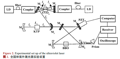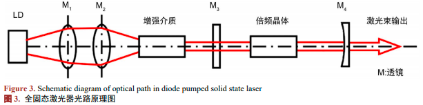 产生紫外固体激光器的主要步骤是首先激光器内的泵浦光源照射到增强介质上从而实现粒子数反转[5],基波红光在谐振腔内形成并且振荡,再通过一次或多次非线性晶体腔内倍频,在经过透射、反射最终从谐振腔输出所需的紫外激光。通常采用 LD 二极管泵浦和灯泵浦的方法得到紫外固体激光器。全固态紫外激光器即 LD 泵浦的紫外固体激光器,其光路原理如图 3 所示[1]。