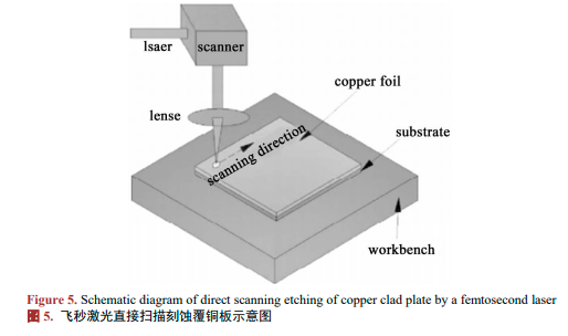 在工业领域中多种电路板的生产制作过程,从最开始的布线到生产成需要高级工艺的微小精密的嵌入式芯片,集成电路板内的柔性电路、聚合物和铜的层布式电路都需要钻微孔和切割[17],也包括电路板上材料的修复和检测,常需要用到等微细加工和处理。电路板加工中激光微加工技术显然成为最佳选择。激光在加工过程中,工作机器不与被加工产品接触,有效避免机械作用力,加工迅速,灵活性高,并且对工作场合无需特殊要求,通过对激光参数的精准设置和研究设计,可以达到微米以下量级[18]。电路板上用的比较传统的钻孔方式是利用紫外激光器和 CO₂激光器用于非金属打标(波长为 10.6 μm 的 CO₂激光器用于非金属材料打标;波长 1064 nm 或者 532 nm 一般用于金属材料打标[19])。目前还是主要采用紫外激光加工技术,可以达到微米级的加工,精确度高,可以制作超细微零器件,可以应用于小于 1 μm 光斑 的激光束的微孔加工。但是 CO₂ 激光器主要打 75~150 mm 的孔,且小孔易错位,而紫外激光器可以打 25 mm 以下的孔,精度高且不会错位[20]。例如在用紫外飞秒激光“冷”加工覆铜线路板中利用综合平 衡法得到最优工艺参数,再用选择性刻蚀的特性达到高质量、高效率线宽 50 μm、线间距 20 μm 的覆铜 板表面微细线路刻蚀加工[21]如图 4 和图 5 所示。