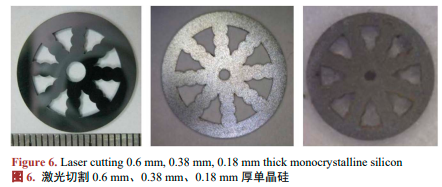 在科学技术和现代工业的快速发展的信息化时代,要达到在更小空间内搭建更多的实验系统并实现 更多的功能,就要加快信息技术的发展更重要的是要制作加工出更小型化、微型化并且仅对材料表面化 学键进行处理[22]的功能齐全的器件。在军事雷达通讯[23]、医学治疗、航空航天和生物化学等领域具有 重要的应用和研究价值。可以在纳米尺度的微光学元件上进行更加深入的切割和优化并研究和开发应用,转变传统的光学元器件功能和特性。微光学元件具有容易批量生产和易于实现阵列化还有简小轻便灵活 等优点,但是它的主要材料是石英玻璃。石英玻璃在应用和处理过程中很容易产生裂纹和凹坑,是一种 硬脆性材料,这就使其光学性能大大减弱。因此,紫外激光的直写“冷”加工技术[24]大大提高了微光学器 件的效率,迅速完成高精度微细结构的微光元器件加工且不伤材料,可以灵活完成大小批量的不同需求 的加工。国外科研机构对紫外紫外加工硅片的研究比较早[25],国内起步较晚随后才对硅片切割技术及切面进行研究[26]。十几年前,张菲等人利用自己研发的紫外全固态激光对微加工系统进行了研究,对相同 材质的三种(0.18 mm、0.38 mm、0.6 mm)的硅片进行优化切割,最小孔径 45 μm,加工精度 20 μm,结果 表明材料没有出现裂痕,激光的热影响较小,飞溅物较少[27]如图 6 所示。