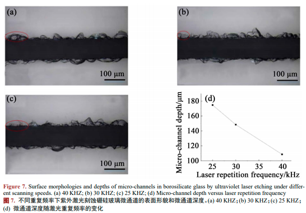 2018 年李奇思等人使用 355 nm 全固态紫外激光器对硼硅玻璃表面和雕刻深度、底面光滑度、通道垂直情况进行研究,实验分析优化加工参数,得到了材料表面损伤小、裂纹少、雕刻深度大、切面垂直 且平整的硼硅玻璃微通道[30]如图 7 所示。