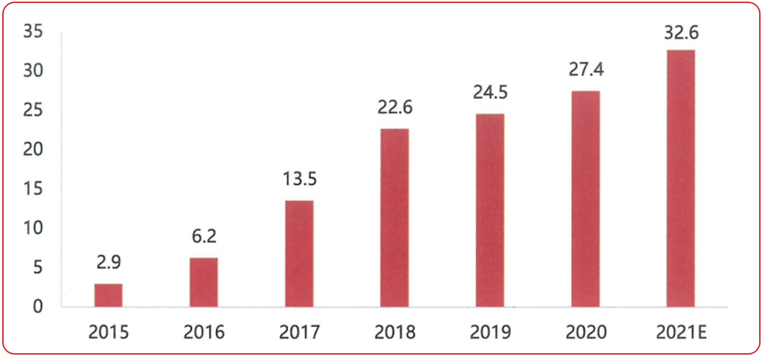 图1. 2015年~2021E年中国超快激光市场(单位:亿元 《2021中国激光产业发展报告》)