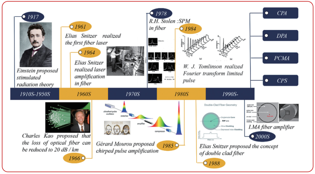 1985年的啁啾脉冲放大技术,1988年的双包层光纤技术,1997年的大模场光纤概念的提出,以及分脉冲放大、多通道相干合束放大、预啁啾管理放大、相干脉冲堆积等技术,都对超快光纤激光的发展有着重要的影响。随着超快光纤激光技术的发展,超快光纤激光器已经成为超快激光市场的主力军,在科研、生产、医疗等诸多领域发挥着作用,尤其在精密/微纳加工、高脉冲能量源、微观动力研究、天文科学等方面更有着不可替代的优势。