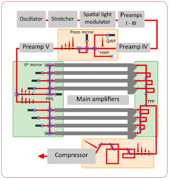 2016年,Tunnerman组利用8路空间相干合成和4个时间分脉冲放大的方案,将8束激光空间相干合成为一束光,再通过时间延迟,将之前分离的脉冲合并为一个脉冲。实验中预放大级用的芯径为72μm的LFP光子晶体光纤棒,8路主放大级分别使用了8根1.1m长芯径为81μm的LFP棒。最终实现了平均功率700W,脉冲能量12mJ,脉宽262fs的超短脉冲输出,合成效率78%[7]。