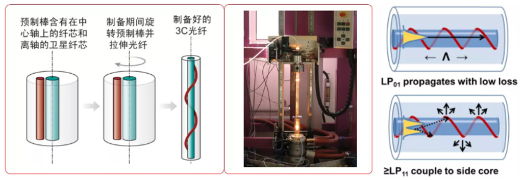 2007年美国Michigan大学超快光学研究中心提出了手性耦合纤芯光纤(3C Chirally-coupled-core),以其能够实现高能量、高峰值功率、单模、保偏的特性逐渐受到人们关注。光纤的石英包层内有两条纤芯,一条是沿轴向分布的中央纤芯,芯径较大,一般在30μm以上,用于信号光的传输;另一条是偏离中心轴、围绕中央纤芯螺旋分布的侧芯,芯径比中央纤芯小得多,只有十几微米,主要作用是控制中央纤芯的模式,将高阶模耦合进侧芯并对其产生高损耗(大于100dB/m),使得中央纤芯中的基模可以极低损耗地传输(小于0.1dB/m)。