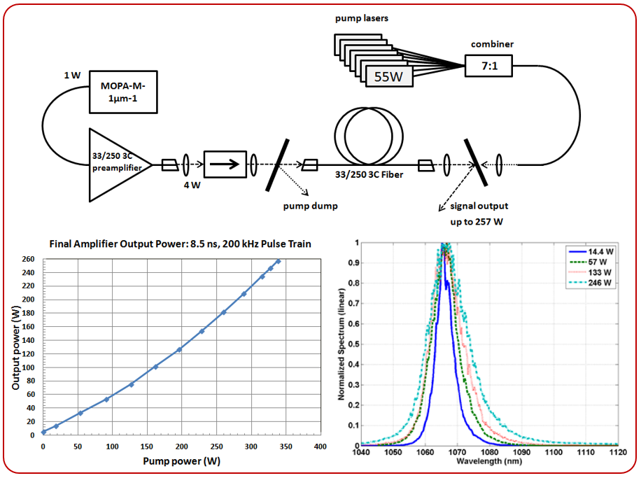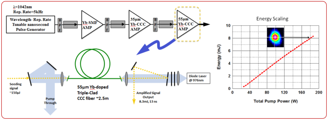 2012年,该研究中心Thomas Sosnowski等人[14]通过33/250μm 3C光纤实现了257W,200kHz,8.5ns,1.2mJ脉冲;86.5uJ,575kW峰值功率脉冲,以及利用55μm 3C光纤实现了41W,8.3mJ,640kW的高能量脉冲输出。