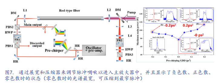 他们将预啁啾管理放大 技术与双通放大技术相结合,利用双通放大的高增益特性允许将振 荡器输出的数十 mW 弱小信号直接放大到百瓦量级的特点,大大简化了实验装置,并通过优化装置参数,在负啁啾下得到了兼具高平 均功率和极短脉宽的结果。PCMA 是一种非线性放大技术,可以放 大光谱宽度超过光纤放大器增益带宽的飞秒脉冲 [10]。