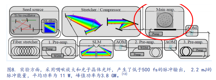 2021 年,中科院物理研究所 / 北京凝聚态物理国家研究中心 光物理实验室科研人员在长期开展超快激光脉冲产生及放大的基础 上,利用双通放大的预啁啾管理放大(Double-pass PCMA,DP-PCMA)技术,与西安电子科技大学合作,在棒状光子晶体光纤中 实现了高增益高平均功率的超短脉冲输出。
