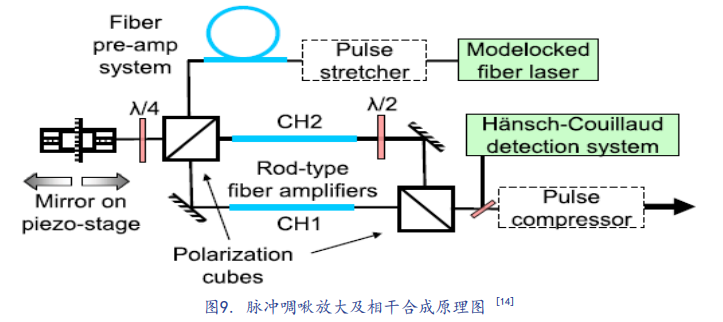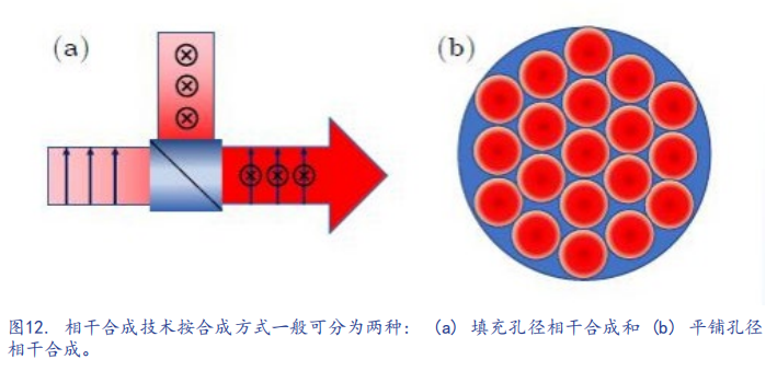 相干合成技术能够突破单根光纤的功率极限,同时解决亮度、 热管理等一系列问题,已成为光纤激光技术中的重要研究方向。相干合成是将一个种子源分成若干路,经放大后再合束及压缩, 产生高功率、高能量的飞秒脉冲。