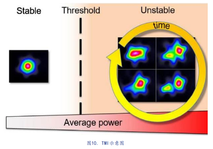 横模不稳定性 (TMI) 现象目前是光纤激光系统(光束质量几乎 衍射受限)平均输出功率的最大限制因素。首次在双通光纤放大 器中对 TMI 进行了实验研究后发现双通放大中的 TMI 阈值明显低 于单通放大。此外,研究揭示了双通光纤放大器中不稳定性的复 杂动态行为。当输入信号是饱和信号时,单程放大横模模式不稳定性(TMI) 阈值高于双程放大。主要原因是双程会产生两个热光效应引起的光 栅(LP01 和 HOM)。当输入信号是低功率小信号时(双程放大), 情况较为复杂 [16]。