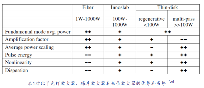 光纤 - 固体混合飞秒脉冲放大技术有效地结合光纤放大器的高增益和固体放大器的高峰值功率、高脉冲能量的优势,最终的高平均功率 / 高峰值功率飞秒激光器可使用光纤振荡器和前置放大器来达到数瓦级,使用Innoslab 放大到数百瓦级,以及使用碟片多通放大器达到数 kW 级的高功率混合光纤 / 固体飞秒激光器逐步商业化,正在开发具有进一步扩展平均功率的新光源——脉冲持续时间短至 400 fs,并且提供灵活的、用户可控的脉冲重复频率;来自种子模块的脉冲可以压缩到短至 250fs 的脉冲持续时间。同时,高功率激光器基于掺镱 (Yb)板条晶体,可实现出色的热管理。