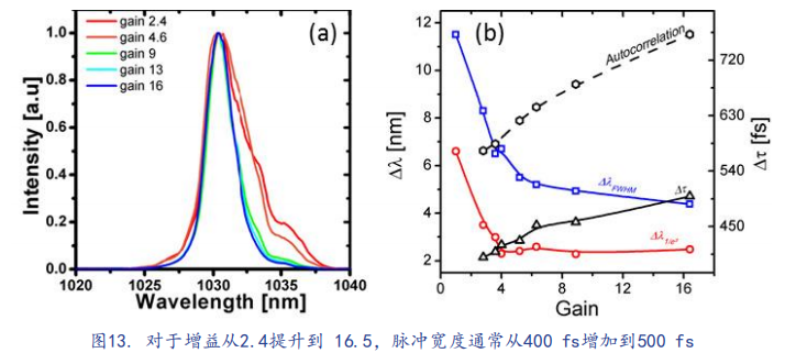 在基于超短脉冲(~1 ps)直接放大的放大器中,非线性光学 效应甚至被证明是有益的。这些系统中的自相位调制 (SPM) 导致放 大过程中,脉冲的光谱带宽增加,因此可以克服“增益窄化”。