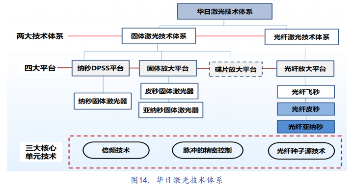 华日激光主要的产品线涵盖固体激光和超快激光两大系列。目前,公司已实现纳秒 / 皮秒 / 飞秒激光器的标准化、批量化制造, 产品应用于国际级客户制程,实现进口替代和全球销售,在航空航天、集成电路和显示器件领域均有丰富的工艺储备和研发经验。此 外,通过产学研合作,华日激光多个项目成果都实现了超快激光器核心 器件国产化,建成了中国超快激光器产业链,解决了超快激光器“卡 脖子”技术难题,在激光精细加工领域得到了广泛应用,支撑了中 国高端激光精密加工装备的可持续发展。