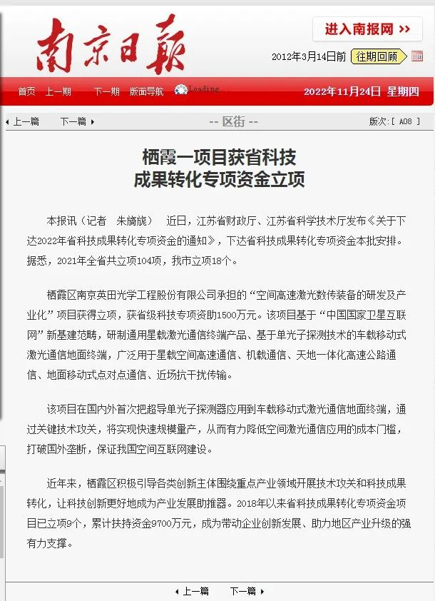 该项目瞄准卫星互联网新基建和关键核心技术瓶颈,以空间高速激光数传装备为主攻方向,围绕加快实现高水平科技自立自强的目标,聚焦加快科技成果转化及产业化。据悉,江苏省共立项104 项,南京市立项18项,栖霞区仅英田光学一项入选。