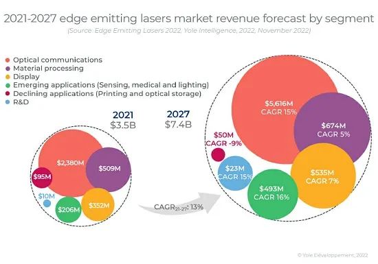 Yole预计,边缘发射激光器(EEL)市场将从2021的35亿美元增长到2027年的74亿美元,在此期间(CAGR2021-2027)的复合年增长率为13%。这种增长将继续受到光通信的驱动,如用于数据通信和电信的光模块和放大器,以及3D传感应用。