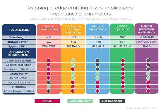 应用定义了器件规格,集成商必须考虑几个技术参数,包括波长、功率输出、光谱分辨率、光束质量和光学强度。因此,了解应用需求和评估激光参数是做出正确投资决策的关键。这一点更为重要,因为EEL价格因设计和技术参数的不同而有很大差异。