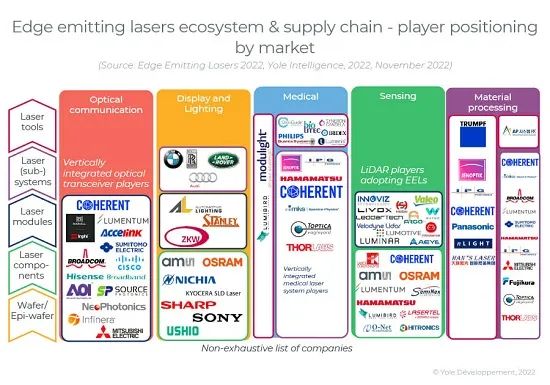 因此,EEL行业高度分散和多样化。每个应用都涉及特定的供应链/价值链。制造商必须制定不同的定位以进入不同的市场。大多数边缘发射激光器制造商都是垂直集成的,即在内部进行外延、前端线尾(FEOL)处理、包括与激光二极管器件的图样相关的所有工艺步骤,以及后端线尾(BEOL)处理,包括互连和封装。