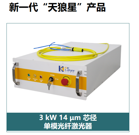基于最新的研究成果,大科激光推出的新一代“天狼星”产品,实现了14μm芯径条件下3kW纯单模输出(M²≤1.1,实测1.05接近衍射极限),能量传输光纤(NA为0.07)长达10m ,拉曼抑制比达到-36dB,总泵浦功率在4360W时输出功率达到3410W(光光转换效率达78.2%),能够适应不同场景的应用需求,已在新能源动力电池焊接、航天航空、3D打印等热点领域实现批量交付,并得到知名集成商、终端用户一致好评。该系列产品已获2022激光加工行业荣格技术创新奖、维科杯·OFweek 2022年度激光行业先进应用奖等多个奖项。此外,20μm芯径的5千瓦纯净单模光纤激光器获中国光学学会设立的首届中国激光金耀奖新产品金奖。
