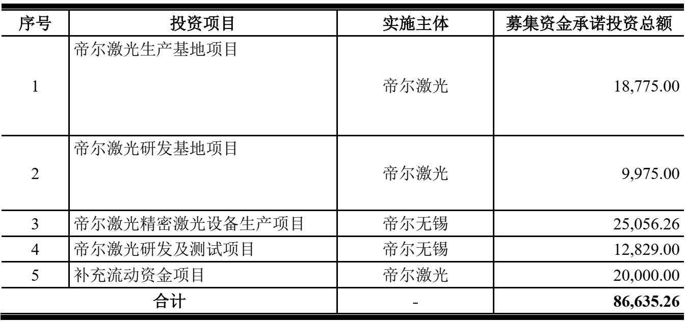 根据帝尔激光的招股说明书,扣除发行费用后,公司首次IPO募集资金净额为8.66亿元。其中,1.88亿元将用于“帝尔激光生产基地项目”、9975万元用于“帝尔激光研发基地项目”、2.51亿元用于“帝尔激光精密激光设备生产项目”、1.28亿元用于“帝尔激光研发及测试项目”、2亿元用于“补充流动资金项目”。
