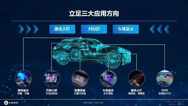 “面向智能汽车,我们推出了三个针对不同应用方向的产品线,分别是:车载显示、HUD和激光大灯。”李屹说。