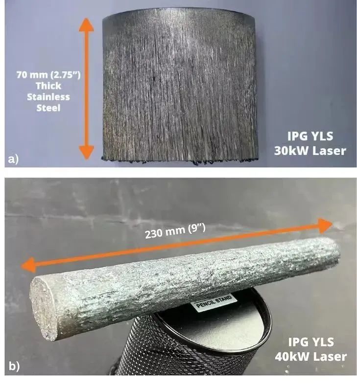 测试显示,随着超高功率激光器功率的增加,切割厚度能力也有所增加。例如,图4显示了在30kW下用氮气切割70 mm厚的不锈钢,以及在40kW下用空气切割230 mm厚的碳钢,两者均在脉冲切割模式下进行。