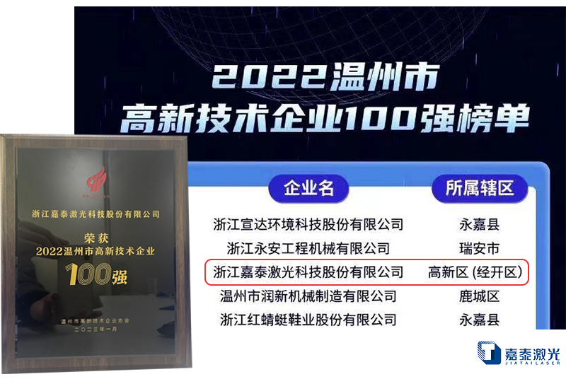 嘉泰激光入围“2022温州市高新技术企业100强”