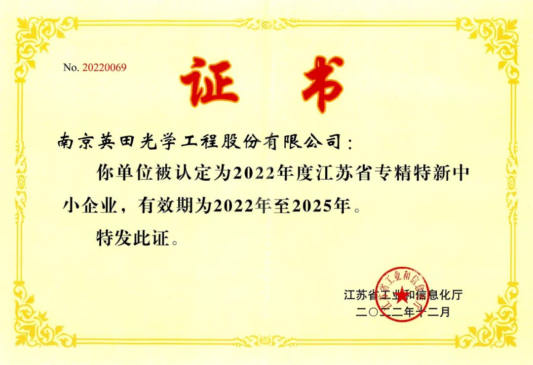 恭喜!英田光学荣获“2022年江苏省专精特新中小企业”