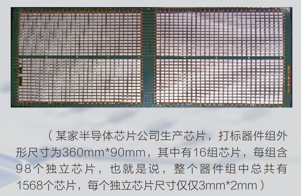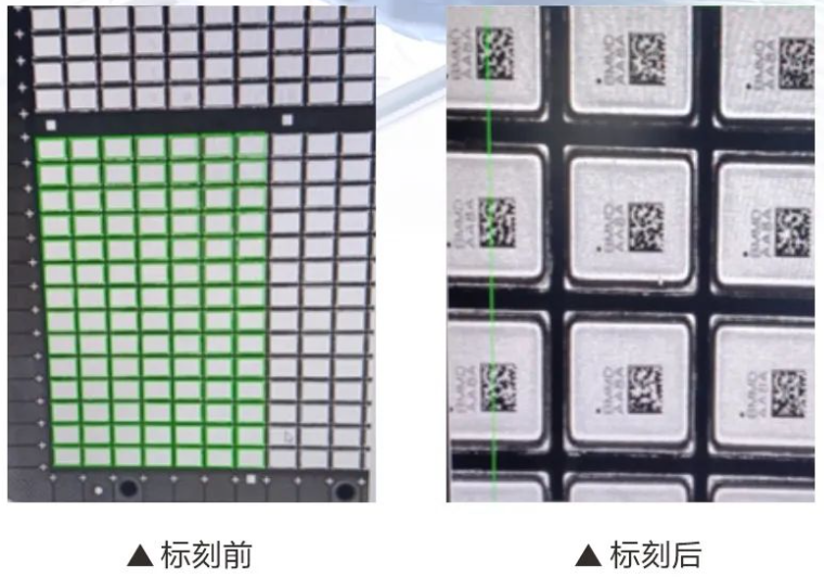 那么配有机器视觉的激光打标机就针对这个尺度的器件进行工作,目的是在每一个独立小芯片的表面标记二维码和型号等信息,要求标记清晰,位置正确,而且不能歪斜。如不采用机器视觉,可能会出现机械误差从而很难全部标记到合适位置;采用机器视觉不但能够清晰的将信息标记到芯片表面,还可以精准标刻、防重复、多个产品一次定位,还具有动态适应性,能够自动修正芯片方位误差,保证打标精度。在激光打标设备中应用机器视觉,不仅能够提升设备的档次,更能提高打标速度。
