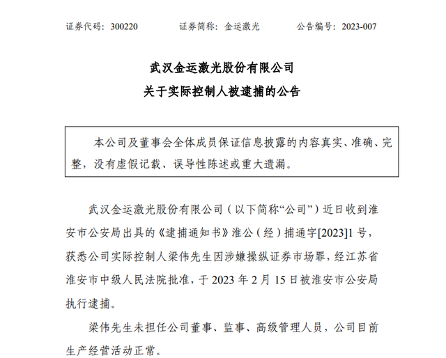 金运激光实控人因涉嫌操纵证券市场罪被逮捕