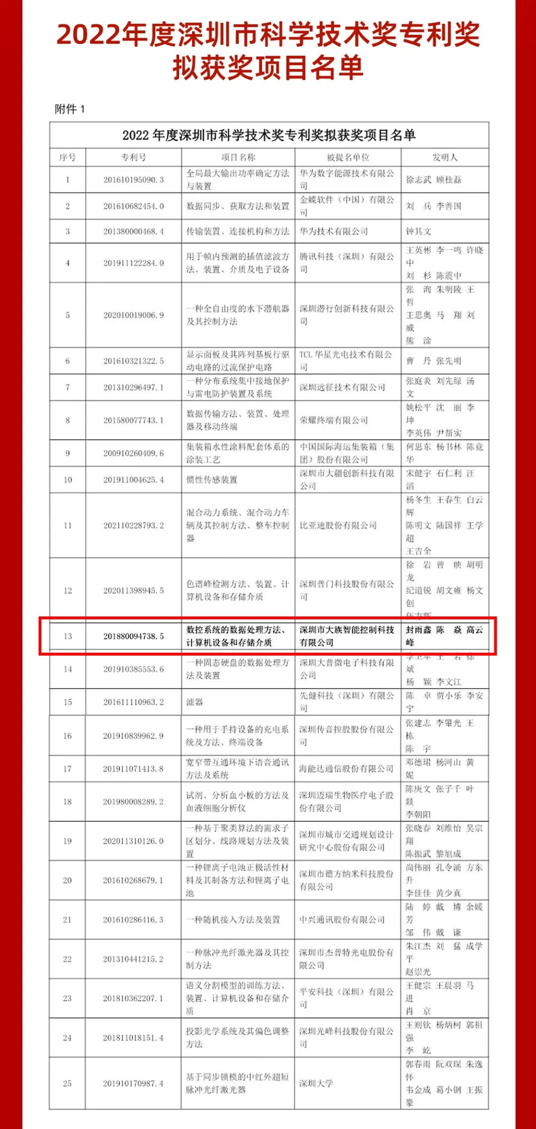 深圳市科学技术奖专利奖每年授奖数量不超过25项,在高新技术企业云集的深圳竞争异常激烈,奖项含金量十足。大族智控“数控系统的数据处理方法、计算机设备和存储介质”专利由深圳自动化学会提名,经过评审、答辩、审批等多项程序严格遴选后,在众多申报的专利中脱颖而出,与腾讯、华为、比亚迪、大疆等各行业巨头企业一同获奖。充分体现了公司在控制技术和数控系统领域的深厚积累和创新能力。
