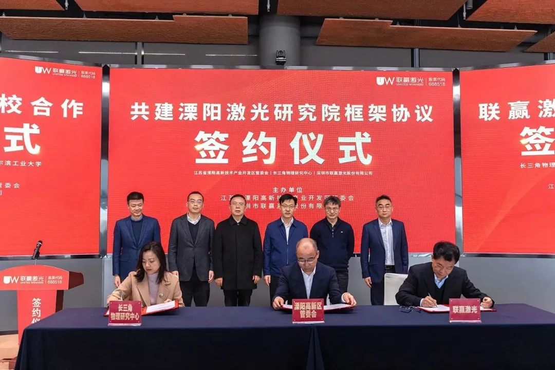 2月19日,深圳市联赢激光股份有公司(以下简称:联赢激光)与溧阳高新区管委会、长三角物理研究中心共建溧阳激光研究院签约仪式、与浙江工业大学、哈尔滨工业大学正式签署战略合作在长三角物理研究中心举行。溧阳市委书记叶明华,中国科学院物理研究所副所长胡江平、溧阳市委常委、高新区党工委副书记、管委会主任朱威、溧阳市人民政府副市长方学军、浙江工业大学机械工程学院院长、激光先进制造研究院院长姚建华、哈尔滨工业大学材料学院院长助理檀财旺,联赢激光董事长韩金龙、副董事长牛增强、副总经理兼财务总监谢强等相关人员出席签约仪式。